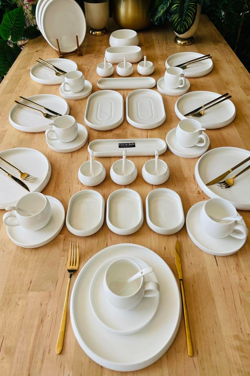 6 adet 20 cm Kahvaltı Tabağı; 6 Adet Porselen Çay Tabağı; 6 Adet Çay Fincanı 175cc; 6 Adet Porselen Çay Kaşığı; 3 Adet Oval Kase 14cm; 2 Adet Zeytinlik 28cm; 2 Adet Peynir Tabağı 20cm; 6 Adet Sos Kaşığı; 6 Adet Sosluk/Reçellik 8,6cm; 1 Adet Kayık Derin Kase 17cm; 1 Adet Büyük Boy Yuvarlak Kase;